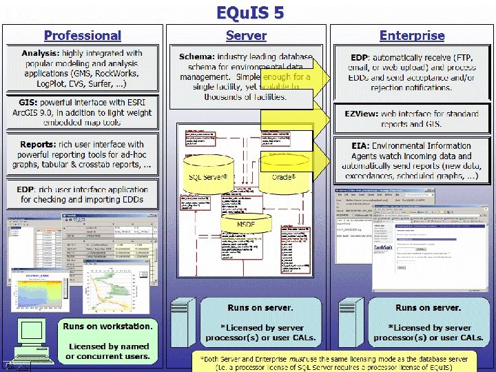 EQu. IS 5 System: Three Components ☼ Trois Composants Server Professional Inter/Intranet Database in Oracle or SQL Server Enterprise Inter/Intranet EQu. IS 5 provides two GUI Interfaces to its database server to suit user needs. Smart-client GUI for Power Users utilisateur puissant EQu. IS 5 fournit deux GUI Interfaces à son serveur de la base de données pour adapter aux besoins de l'utilisateur. Thin-client GUI for Casual Users utilisateur informel
