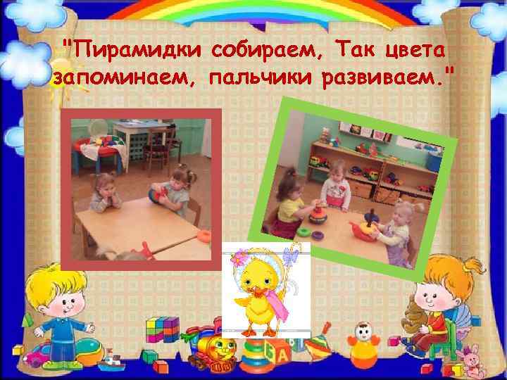 "Пирамидки собираем, Так цвета запоминаем, пальчики развиваем. "
