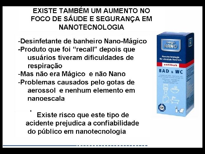 Impactos Sociais • O desenvolvimento de produtos com tecnologia nano pode criar mudanças significativas nos planos social e econômico. • Haverá criação de empregos em novas áreas, mas outros irão desaparecer. • O avanço da nanotecnologia pode possibilitar que países em desenvolvimento entrem em compasso com países desenvolvidos, mas pode também aumentar as diferenças entres estes: