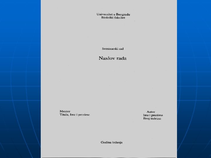 Изглед насловне стране и њене одлике n n n Врх насловне стране: Установа на којој је рад рађен, Средина стране: Наслов рада (назив теме обрађене у раду), Леви доњи угао стране: Име, презиме и титула ментора, Десни доњи угао: име и презиме и број индекса аутора, Дно стране: година издања,