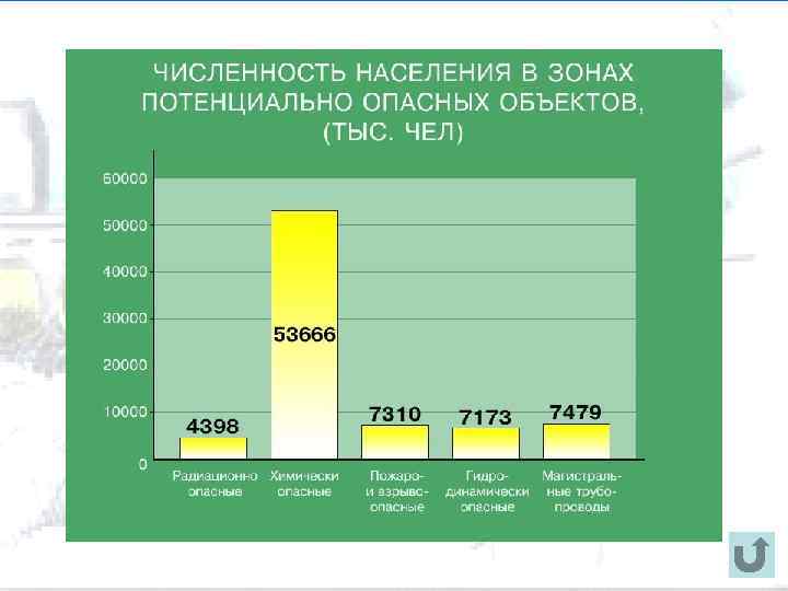 Классификация химических объектов по степени опасности Степень химической опасности Численность населения, проживающего в зоне возможного заражения, человек 1 Более 75 тысяч 2 От 40 тыс. до 74 тыс. 3 До 40 тысяч 4 Зона возможного заражения не выходит за пределы территории объекта или её санитарно-защитной зоны