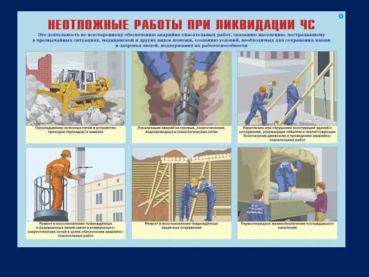 К неотложным работам относятся: 1. прокладывание колонных путей и устройство проходов в завалах и зонах заражения 2. локализация аварий на коммунально-энергетических и технологических сетях 3. укрепление или обрушение угрожающих обвалом конструкций зданий (сооружений) на путях движения к участкам проведения работ