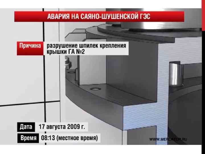 ПРИЧИНЫ АВАРИИ Организационные • ослабление технологической дисциплины и ответственности, отсутствие полноценного контроля за техническим состоянием оборудования • снижение роли ремонтно-восстановительных работ, ремонты выполняют неквалифицированные организации без шеф-контроля со стороны производителей оборудования. • отсутствие в нормативной документации положений о систематическом контроле и дефектоскопии наиболее нагруженных и сложных узлов и креплений, особенно для уникального по своим характеристикам оборудования • отсутствие научно-технического сопровождения процесса эксплуатации уникальных гидроэнергетических комплексов и развития подотрасли в целом