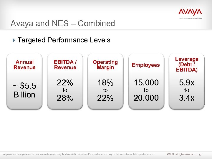 Avaya and NES – Combined 4 Targeted Performance Levels Annual Revenue ~ $5. 5 Billion EBITDA / Revenue Operating Margin Employees Leverage (Debt / EBITDA) 22% 18% 15, 000 5. 9 x 28% 22% 20, 000 3. 4 x to to to Avaya makes no representations or warranties regarding this financial information. Past performance may not be indicative of future performance. to © 2009. All rights reserved. 10