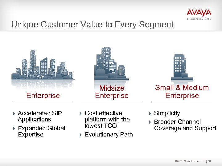Unique Customer Value to Every Segment Enterprise 4 Accelerated SIP Applications 4 Expanded Global Expertise Midsize Enterprise 4 Cost effective platform with the lowest TCO 4 Evolutionary Path Small & Medium Enterprise 4 Simplicity 4 Broader Channel Coverage and Support © 2009. All rights reserved. 18