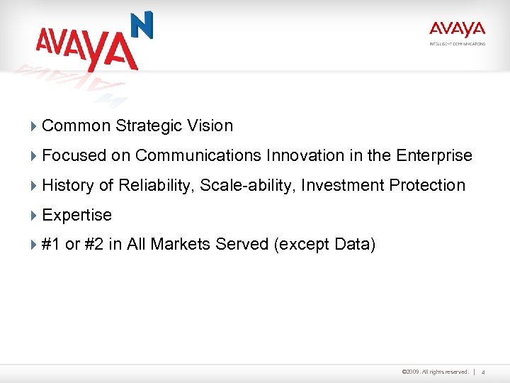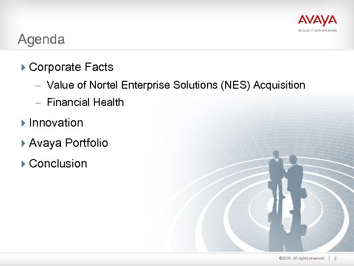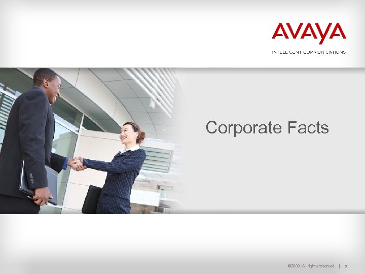 Agenda 4 Corporate Facts – Value of Nortel Enterprise Solutions (NES) Acquisition – Financial Health 4 Innovation 4 Avaya Portfolio 4 Conclusion © 2009. All rights reserved. 2