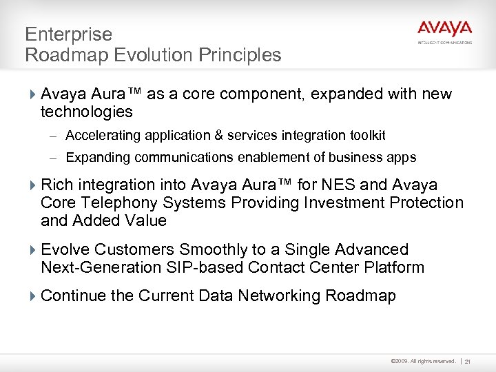 Common Evolutionary Path Preserve & Enhance Call Center Evolution Investments Best. PBX Disaggregation in Class Capability IT Convergence Accelerating Your Evolution Migration that fits your Communications Enabled Applications business needs Plug & Play UC Communications Multimodal A Path Communications for Every Customer Complementary technology roadmaps driving accelerated execution © 2009 Avaya Inc. All rights reserved. © 2009. 20