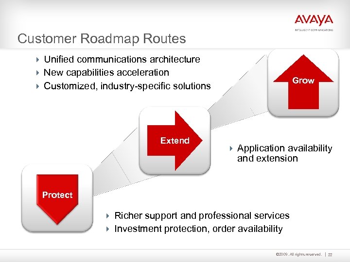 Enterprise Roadmap Evolution Principles 4 Avaya Aura™ as a core component, expanded with new technologies – Accelerating application & services integration toolkit – Expanding communications enablement of business apps 4 Rich integration into Avaya Aura™ for NES and Avaya Core Telephony Systems Providing Investment Protection and Added Value 4 Evolve Customers Smoothly to a Single Advanced Next-Generation SIP-based Contact Center Platform 4 Continue the Current Data Networking Roadmap © 2009. All rights reserved. 21