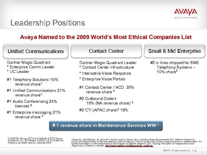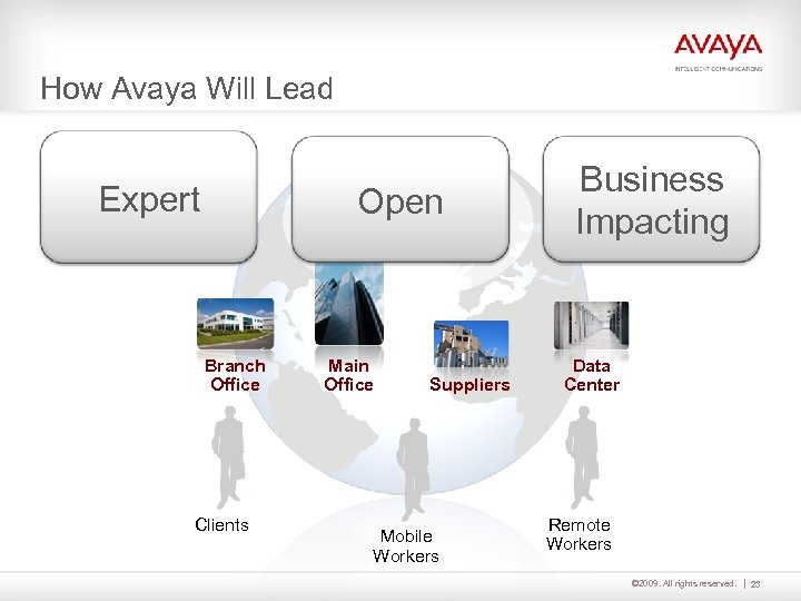 How Avaya Will Lead Expert Open Branch Office Clients Main Office Suppliers Mobile Workers Business Impacting Data Center Remote Workers © 2009. All rights reserved. 23