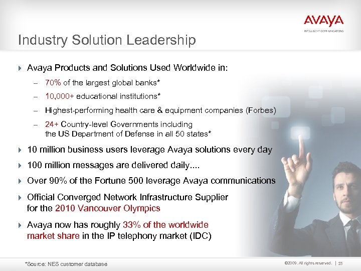 Industry Solution Leadership 4 Avaya Products and Solutions Used Worldwide in: – 70% of the largest global banks* – 10, 000+ educational institutions* – Highest-performing health care & equipment companies (Forbes) – 24+ Country-level Governments including the US Department of Defense in all 50 states* 4 10 million business users leverage Avaya solutions every day 4 100 million messages are delivered daily. . 4 Over 90% of the Fortune 500 leverage Avaya communications 4 Official Converged Network Infrastructure Supplier for the 2010 Vancouver Olympics 4 Avaya now has roughly 33% of the worldwide market share in the IP telephony market (IDC) *Source: NES customer database © 2009. All rights reserved. 25