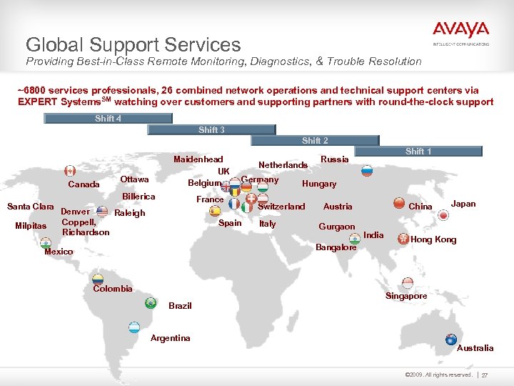 Avaya’s Global Footprint Toronto Denver, CO Santa Clara, CA Mexico City Guilford, UK Frankfurt, DE Basking Ridge, NJ Headquarters Beijing Shanghai Israel Research Triangle Park, NC Japan Dubai Mumbai Static version of Global Footprint slide. Singapore São Paulo Key Corporate Locations Avaya Lab Locations 10, 000+ Channel Partners Sydney 32 Global Delivery Support Centers 19, 000+ Employees Operating in 55 Countries © 2009. All rights reserved. 32