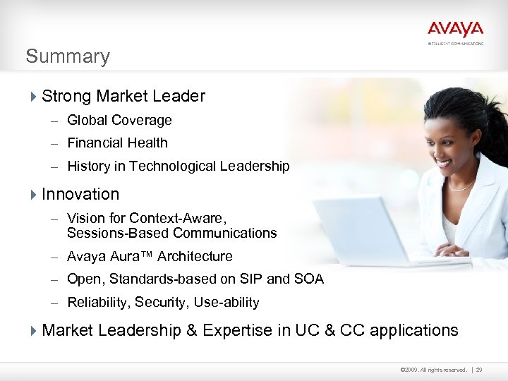 Summary 4 Strong Market Leader – Global Coverage – Financial Health – History in Technological Leadership 4 Innovation – Vision for Context-Aware, Sessions-Based Communications – Avaya Aura™ Architecture – Open, Standards-based on SIP and SOA – Reliability, Security, Use-ability 4 Market Leadership & Expertise in UC & CC applications © 2009. All rights reserved. 29
