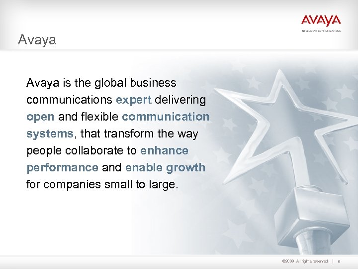 Avaya is the global business communications expert delivering open and flexible communication systems, that transform the way people collaborate to enhance performance and enable growth for companies small to large. © 2009. All rights reserved. 6
