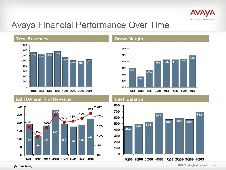 NES Acquisition Financing 4 Purchase Price $900 M 4 Financing is a combination of cash, debt and equity 4 Additional financing committed – cost and pricing of debt not impacted by rating 4 NES Financially Restructuring Assets as Required by Bankruptcy before purchase by Avaya 4 Apply Avaya Operational Improvement Programs © 2009. All rights reserved. 8