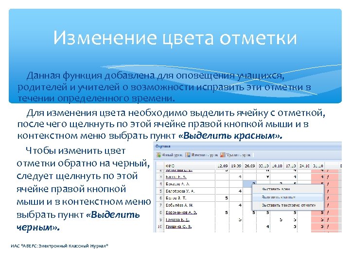 Изменение цвета отметки Данная функция добавлена для оповещения учащихся, родителей и учителей о возможности исправить эти отметки в течении определенного времени. Для изменения цвета необходимо выделить ячейку с отметкой, после чего щелкнуть по этой ячейке правой кнопкой мыши и в контекстном меню выбрать пункт «Выделить красным» . Чтобы изменить цвет отметки обратно на черный, следует щелкнуть по этой ячейке правой кнопкой мыши и в контекстном меню выбрать пункт «Выделить черным» . ИАС "АВЕРС: Электронный Классный Журнал"