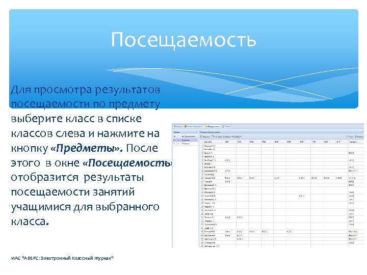 Посещаемость Для просмотра результатов посещаемости по предмету выберите класс в списке классов слева и нажмите на кнопку «Предметы» . После этого в окне «Посещаемость» отобразится результаты посещаемости занятий учащимися для выбранного класса. ИАС "АВЕРС: Электронный Классный Журнал"