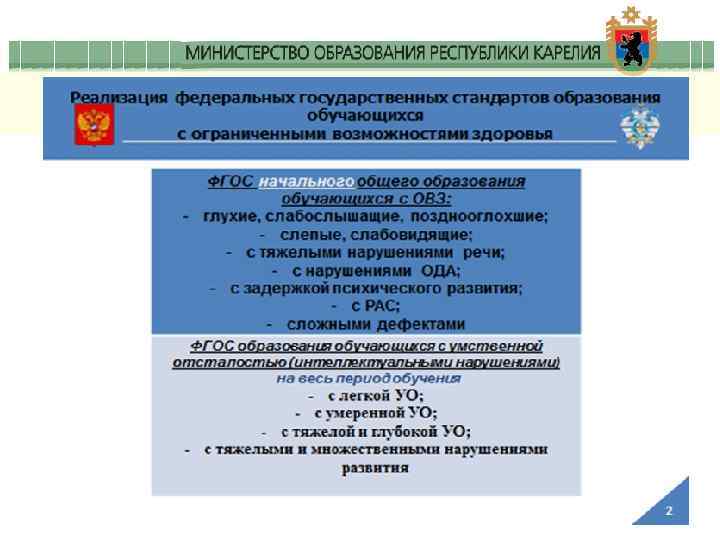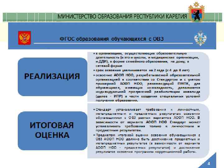 Для реализации Федерального закона от 29 декабря 2012 года № 273 -ФЗ «Об образовании в Российской Федерации» Минобрнауки России подготовлены приказы: • «Об утверждении федерального государственного образовательного стандарта обучающихся с умственной отсталостью (интеллектуальными нарушениями)» № 1599 от 19 декабря 2014 г. «Об утверждении федерального государственного образовательного стандарта начального общего образования обучающихся с ограниченными возможностями здоровья» № 1598 от 19 декабря 2014 г. ФГОС ОВЗ представляет собой совокупность обязательных требований к адаптированным образовательным программам, которые предлагают школы и другие организациях, осуществляющие образовательную деятельность. Стандарт разработан на основе Конституции и законодательства Российской Федерации с учетом Конвенций ООН о правах ребенка и о правах инвалидов. При разработке стандарта учитывались региональные, национальные и этнокультурные потребности граждан Российской Федерации.