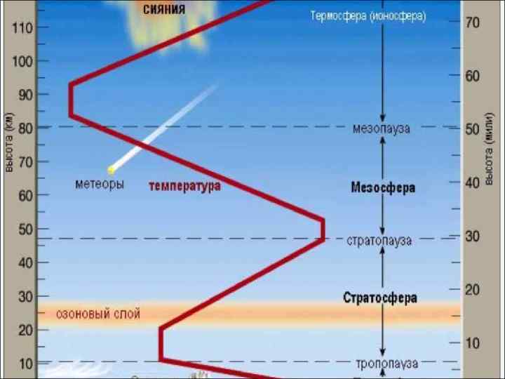 Строение атмосферы Наиболее отчетливо различие в свойствах слоев атмосферы проявляется в характере изменения температуры воздуха с высотой. По этому признаку атмосфера делится на пять основных слоев. Слой Средняя высота верхней и нижней границ, км Переходный слой Тропосфера Стратосфера Мезосфера 0 -11 11 -50 50 -90 Тропопауза Стратопауза Мезопауза Термосфера 90 -450 Термопауза Экзосфера >450 -