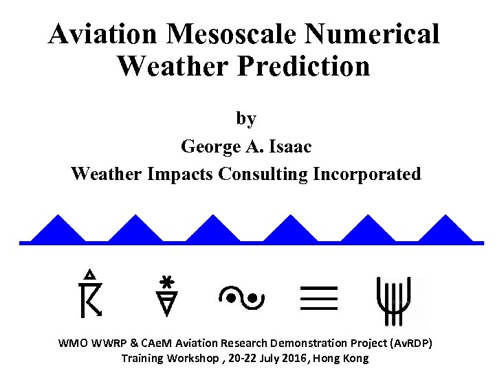 Aviation Mesoscale Numerical Weather Prediction by George A. Isaac Weather Impacts Consulting Incorporated WMO WWRP & CAe. M Aviation Research Demonstration Project (Av. RDP) Training Workshop , 20 -22 July 2016, Hong Kong