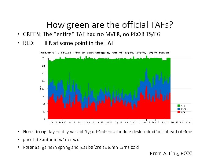 How green are the official TAFs? • GREEN: The *entire* TAF had no MVFR, no PROB TS/FG • RED: IFR at some point in the TAF • Note strong day-to-day variability; difficult to schedule desk reductions ahead of time • poor late autumn-winter wx • Potential gains in spring and just before autumn turns cold From A. Ling, ECCC