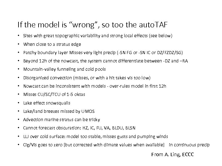 If the model is “wrong”, so too the auto. TAF • Sites with great topographic variability and strong local effects (see below) • When close to a stratus edge • Patchy boundary layer Misses very light precip (-SN FG or -SN IC or DZ/FZDZ/SG) • Beyond 12 h of the nowcast, the system cannot differentiate between -DZ and –RA • Mountain-valley funneling and cold pools • Disorganized convection (misses, or with a hit takes vis too low) • Nowcast can be inconsistent with models - over-rules model in first 12 h • Misses CU/SC/TCU of 1 -5 oktas • Lake effect snowsqualls • Lake/land breezes missed by UMOS • Advection marine stratus can be tricky • Cannot forecast obscuration: HZ, IC, FU, VA, BLDU, BLSN • LLJ over cold surface: model too stable, misses gusts and pumping winds • Cig/Vis goes to zero [but corrected with climate values when available] in continuous precip From A. Ling, ECCC