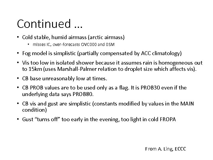 Continued … • Cold stable, humid airmass (arctic airmass) • misses IC, over-forecasts OVC 000 and 0 SM • Fog model is simplistic (partially compensated by ACC climatology) • Vis too low in isolated shower because it assumes rain is homogeneous out to 15 km (uses Marshall-Palmer relation to droplet size which affects vis). • CB base unreasonably low at times. • CB PROB values are to be used only as a flag. It is PROB 30 even if the underlying data says PROB 80. • CB vis and gust are simplistic (constants modified by values in the MAIN condition) • Gust “turns off” too early in the evening, too light in cold FROPA From A. Ling, ECCC