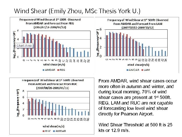 Wind Shear (Emily Zhou, MSc Thesis York U. ) From AMDAR, wind shear cases occur more often in autumn and winter, and during local morning. 70% of wind shear cases are present at 1 st 500 ft. REG, LAM and RUC are not capable of forecasting low level wind shear directly for Pearson Airport. Wind Shear Threshold at 500 ft is 25 kts or 12. 9 m/s.