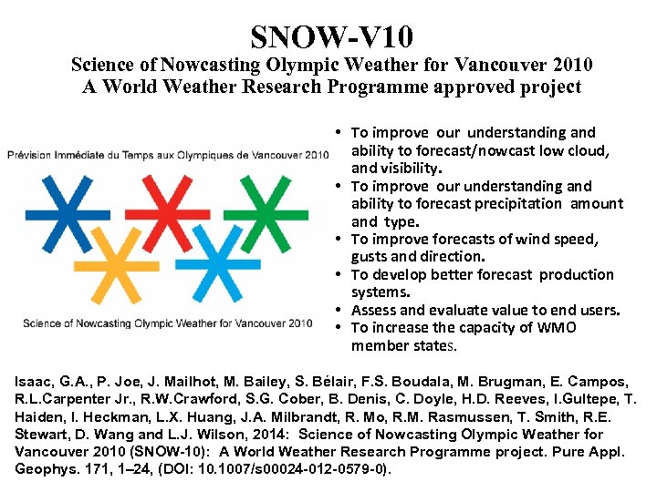 SNOW-V 10 Science of Nowcasting Olympic Weather for Vancouver 2010 A World Weather Research Programme approved project • To improve our understanding and ability to forecast/nowcast low cloud, and visibility. • To improve our understanding and ability to forecast precipitation amount and type. • To improve forecasts of wind speed, gusts and direction. • To develop better forecast production systems. • Assess and evaluate value to end users. • To increase the capacity of WMO member states. Isaac, G. A. , P. Joe, J. Mailhot, M. Bailey, S. Bélair, F. S. Boudala, M. Brugman, E. Campos, R. L. Carpenter Jr. , R. W. Crawford, S. G. Cober, B. Denis, C. Doyle, H. D. Reeves, I. Gultepe, T. Haiden, I. Heckman, L. X. Huang, J. A. Milbrandt, R. Mo, R. M. Rasmussen, T. Smith, R. E. Stewart, D. Wang and L. J. Wilson, 2014: Science of Nowcasting Olympic Weather for Vancouver 2010 (SNOW-10): A World Weather Research Programme project. Pure Appl. Geophys. 171, 1– 24, (DOI: 10. 1007/s 00024 -012 -0579 -0).