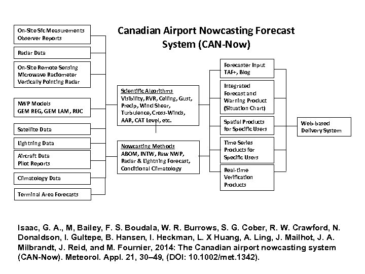 On-Site Sfc Measurements Observer Reports Radar Data Canadian Airport Nowcasting Forecast System (CAN-Now) Forecaster Input TAF+, Blog On-Site Remote Sensing Microwave Radiometer Vertically Pointing Radar NWP Models GEM REG, GEM LAM, RUC Scientific Algorithms Visibility, RVR, Ceiling, Gust, Precip, Wind Shear, Turbulence, Cross-Winds, AAR, CAT Level, etc. Satellite Data Lightning Data Aircraft Data Pilot Reports Climatology Data Nowcasting Methods ABOM, INTW, Raw NWP, Radar & Lightning Forecast, Conditional Climatology Integrated Forecast and Warning Product (Situation Chart) Spatial Products for Specific Users Web-based Delivery System Time Series Products for Specific Users Real-time Verification Products Terminal Area Forecasts Isaac, G. A. , M, Bailey, F. S. Boudala, W. R. Burrows, S. G. Cober, R. W. Crawford, N. Donaldson, I. Gultepe, B. Hansen, I. Heckman, L. X Huang, A. Ling, J. Mailhot, J. A. Milbrandt, J. Reid, and M. Fournier, 2014: The Canadian airport nowcasting system (CAN-Now). Meteorol. Appl. 21, 30– 49, (DOI: 10. 1002/met. 1342).