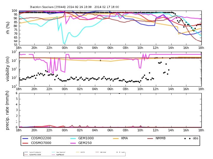 Fog event missed during FROST 2014 (February 17, 2014) by both model scheme used during SNOW -V 10 and diagnostic method of Boudala et al. (2012) using Nowcast RH. Model failed to produce cloud at low levels. The model visibility scheme is descrbed in Gultepe and Milbrandt (2010). Gultepe I, Milbrandt JA. 2010: Probabilistic parameterizations of visibility using observations of rain precipitation rate, relative humidity, and visibility. J. Appl. Meteorol. Climatol. 49: 36– 46.