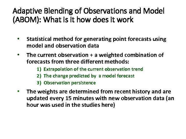 Adaptive Blending of Observations and Model (ABOM): What is it how does it work • • Statistical method for generating point forecasts using model and observation data The current observation + a weighted combination of forecasts from three different methods: 1) Extrapolation of the current observation trend 2) The change predicted by a model forecast 3) Observation persistence • The weights are determined from recent history and are updated every 15 minutes with new observation data (an hour was used in the studies here)