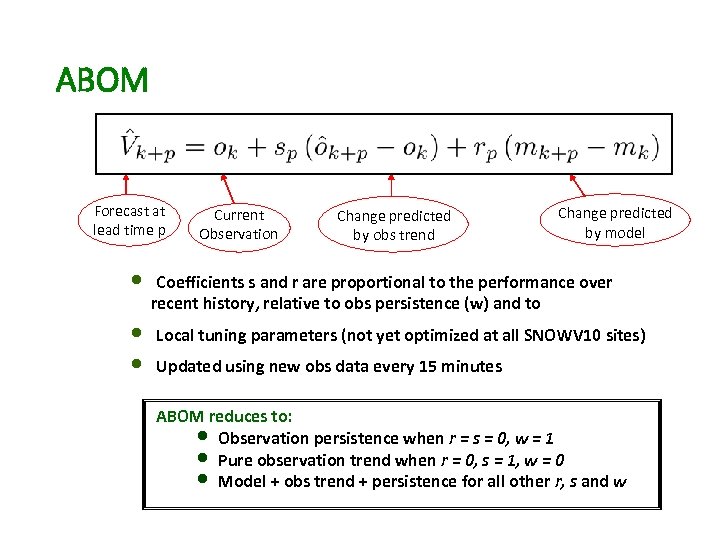 ABOM Forecast at lead time p Current Observation Change predicted by obs trend Change predicted by model • Coefficients s and r are proportional to the performance over recent history, relative to obs persistence (w) and to • • Local tuning parameters (not yet optimized at all SNOWV 10 sites) Updated using new obs data every 15 minutes ABOM reduces to: • Observation persistence when r = s = 0, w = 1 • Pure observation trend when r = 0, s = 1, w = 0 • Model + obs trend + persistence for all other r, s and w
