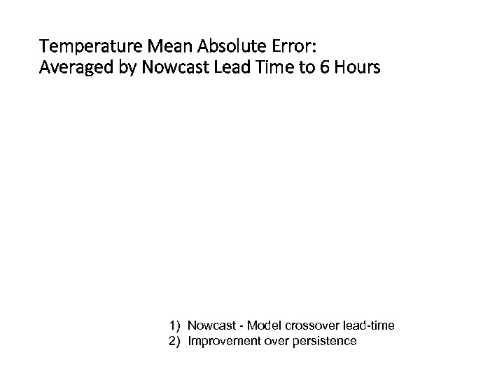 Temperature Mean Absolute Error: Averaged by Nowcast Lead Time to 6 Hours 1) Nowcast - Model crossover lead-time 2) Improvement over persistence