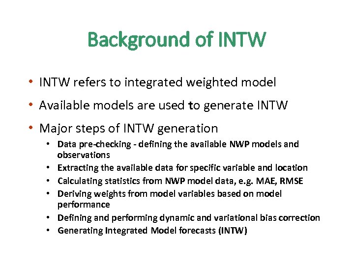 Background of INTW • INTW refers to integrated weighted model • Available models are used to generate INTW • Major steps of INTW generation • Data pre-checking - defining the available NWP models and observations • Extracting the available data for specific variable and location • Calculating statistics from NWP model data, e. g. MAE, RMSE • Deriving weights from model variables based on model performance • Defining and performing dynamic and variational bias correction • Generating Integrated Model forecasts (INTW)