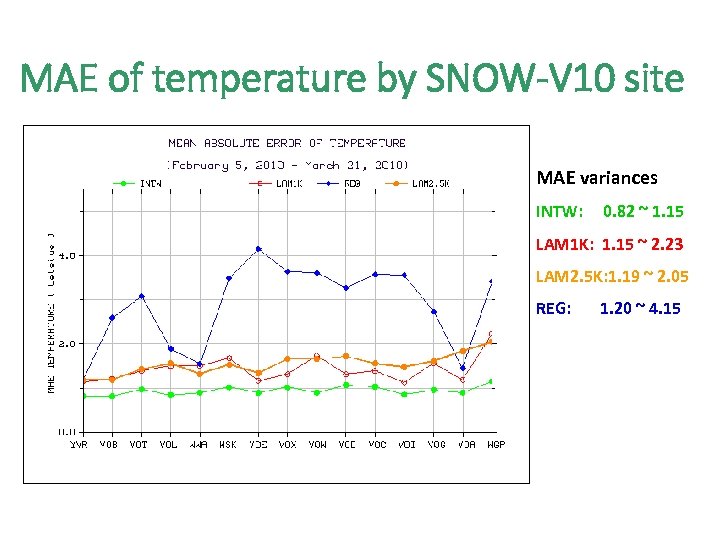 MAE of temperature by SNOW-V 10 site MAE variances INTW: 0. 82 ~ 1. 15 LAM 1 K: 1. 15 ~ 2. 23 LAM 2. 5 K: 1. 19 ~ 2. 05 REG: 1. 20 ~ 4. 15