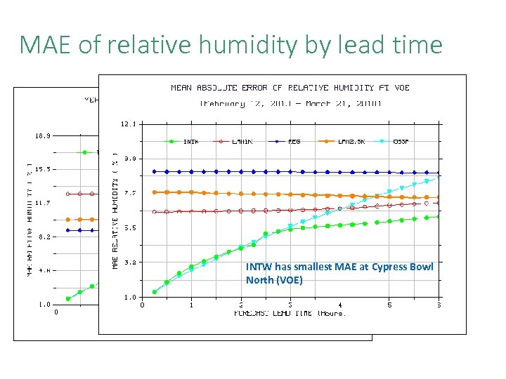 MAE of relative humidity by lead time INTW has largest MAE at INTW has smallest MAE at Cypress Bowl Callaghan Valley (VOD) North (VOE)