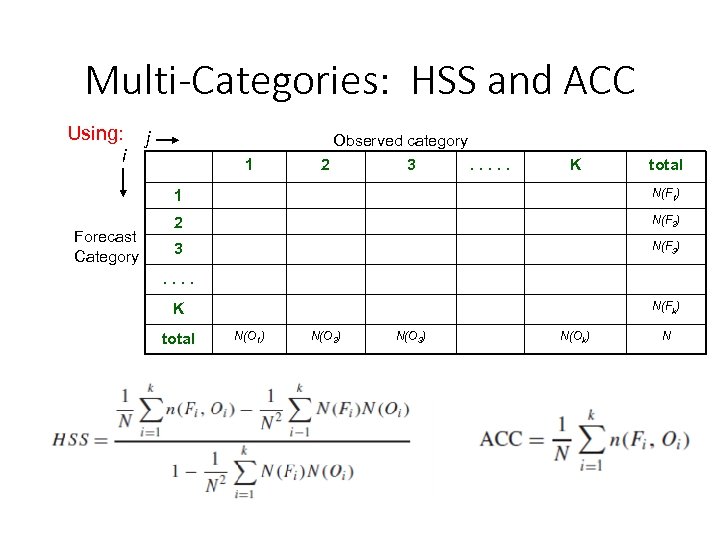 Multi-Categories: HSS and ACC Using: i j Observed category 1 2 3 . . . K total 1 Forecast Category N(F 1) 2 N(F 2) 3 N(F 3) . . N(Fk) K total N(O 1) N(O 2) N(O 3) N(Ok) N