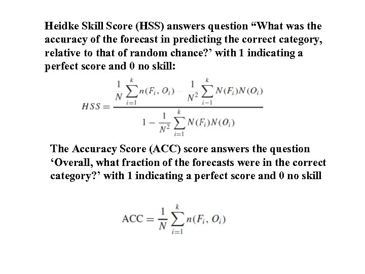 Heidke Skill Score (HSS) answers question “What was the accuracy of the forecast in predicting the correct category, relative to that of random chance? ’ with 1 indicating a perfect score and 0 no skill: The Accuracy Score (ACC) score answers the question ‘Overall, what fraction of the forecasts were in the correct category? ’ with 1 indicating a perfect score and 0 no skill