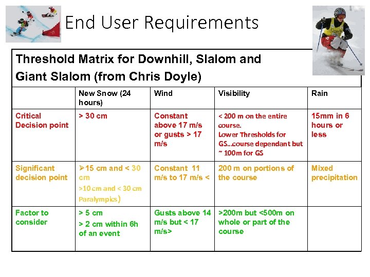End User Requirements Threshold Matrix for Downhill, Slalom and Giant Slalom (from Chris Doyle) New Snow (24 hours) Wind Visibility Rain Critical Decision point > 30 cm Constant above 17 m/s or gusts > 17 m/s < 200 m on the entire course. Lower Thresholds for GS…course dependant but ~ 100 m for GS 15 mm in 6 hours or less Significant decision point Ø 15 cm and < 30 cm >10 cm and < 30 cm Paralympics) Constant 11 m/s to 17 m/s < 200 m on portions of the course Mixed precipitation Factor to consider > 5 cm > 2 cm within 6 h of an event Gusts above 14 >200 m but <500 m on m/s but < 17 whole or part of the m/s> course