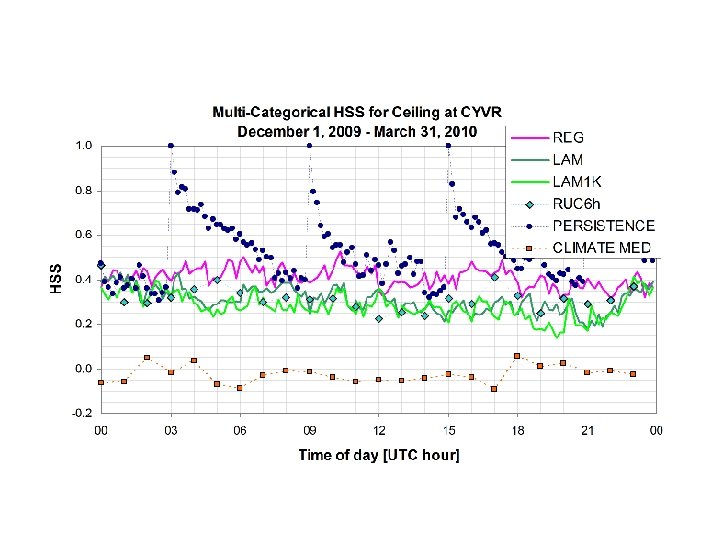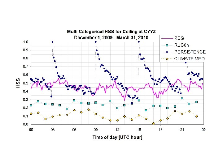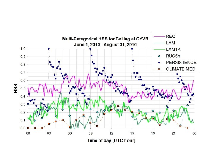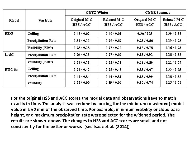 CYYZ Winter CYYZ Summer Relaxed M-C HSS / ACC Ceiling 0. 45 / 0. 62 0. 46 / 0. 61 0. 36 / 063 0. 30 / 0. 55 0. 30 / 0. 70 0. 26 / 0. 62 0. 23 / 0. 86 0. 19 / 0. 78 0. 28 / 0. 78 0. 27 / 0. 70 0. 15 / 0. 78 0. 16 / 0. 73 Precipitation Rate 0. 29 / 0. 73 0. 27 / 0. 67 0. 18 / 0. 91 0. 18 / 0. 85 0. 24 / 0. 75 0. 25 / 0. 71 0. 08 / 0. 80 0. 11 / 0. 77 Ceiling 0. 24 / 0. 47 0. 25 / 0. 45 0. 33 / 0. 67 0. 33 / 0. 63 Precipitation Rate 0. 40 / 0. 84 0. 40 / 0. 81 0. 18 / 0. 90 0. 18 / 0. 85 Visibility RUC 6 h Original M-C HSS / ACC Visibility (BI 09) LAM Relaxed M-C HSS / ACC Visibility (BI 09) REG Original M-C HSS / ACC Precipitation Rate Model 0. 22 / 0. 66 0. 19 / 0. 60 0. 16 / 0. 74 0. 15 / 0. 70 Variable For the original HSS and ACC scores the model data and observations have to match exactly in time. The analysis was redone by looking for the minimum (maximum) model value in ± 60 min of the observed time. For example, minimum visibility or cloud base height, and maximum precipitation rate were selected for the widened period. The results are shown above. The changes to HSS and ACC scores are small and not consistently for the better or worse. (see Isaac et al. (2014))