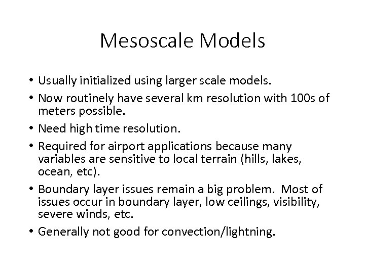 Mesoscale Models • Usually initialized using larger scale models. • Now routinely have several km resolution with 100 s of meters possible. • Need high time resolution. • Required for airport applications because many variables are sensitive to local terrain (hills, lakes, ocean, etc). • Boundary layer issues remain a big problem. Most of issues occur in boundary layer, low ceilings, visibility, severe winds, etc. • Generally not good for convection/lightning.
