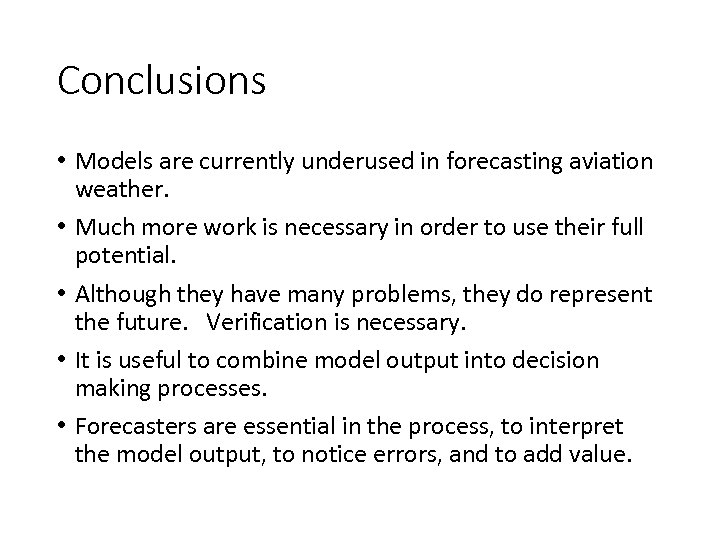 Conclusions • Models are currently underused in forecasting aviation weather. • Much more work is necessary in order to use their full potential. • Although they have many problems, they do represent the future. Verification is necessary. • It is useful to combine model output into decision making processes. • Forecasters are essential in the process, to interpret the model output, to notice errors, and to add value.