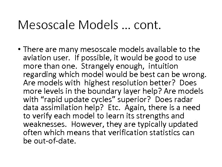 Mesoscale Models … cont. • There are many mesoscale models available to the aviation user. If possible, it would be good to use more than one. Strangely enough, intuition regarding which model would be best can be wrong. Are models with highest resolution better? Does more levels in the boundary layer help? Are models with “rapid update cycles” superior? Does radar data assimilation help? Etc. Again, there is a need to verify each model to learn its strengths and weaknesses. However, they are typically updated often which means that verification statistics can be out-of-date.