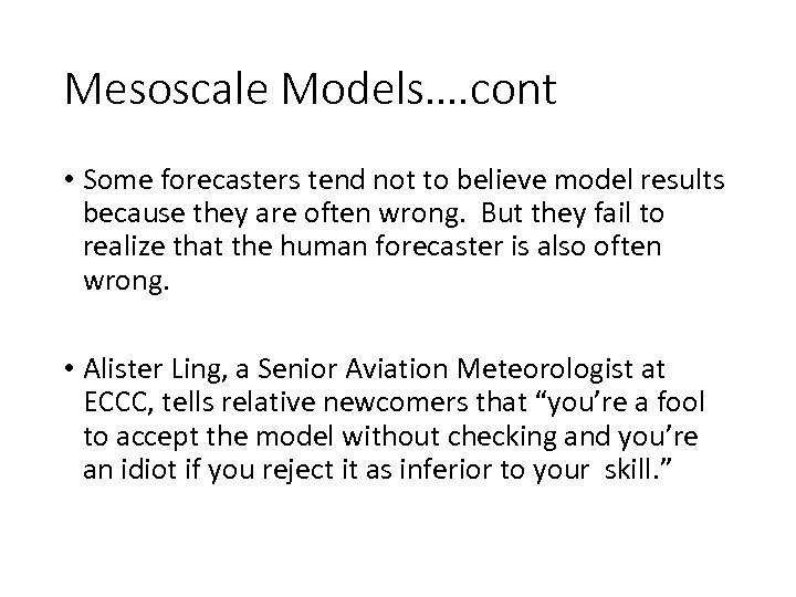 Mesoscale Models…. cont • Some forecasters tend not to believe model results because they are often wrong. But they fail to realize that the human forecaster is also often wrong. • Alister Ling, a Senior Aviation Meteorologist at ECCC, tells relative newcomers that “you’re a fool to accept the model without checking and you’re an idiot if you reject it as inferior to your skill. ”
