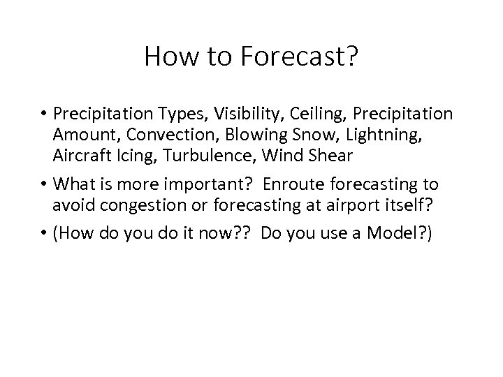 How to Forecast? • Precipitation Types, Visibility, Ceiling, Precipitation Amount, Convection, Blowing Snow, Lightning, Aircraft Icing, Turbulence, Wind Shear • What is more important? Enroute forecasting to avoid congestion or forecasting at airport itself? • (How do you do it now? ? Do you use a Model? )