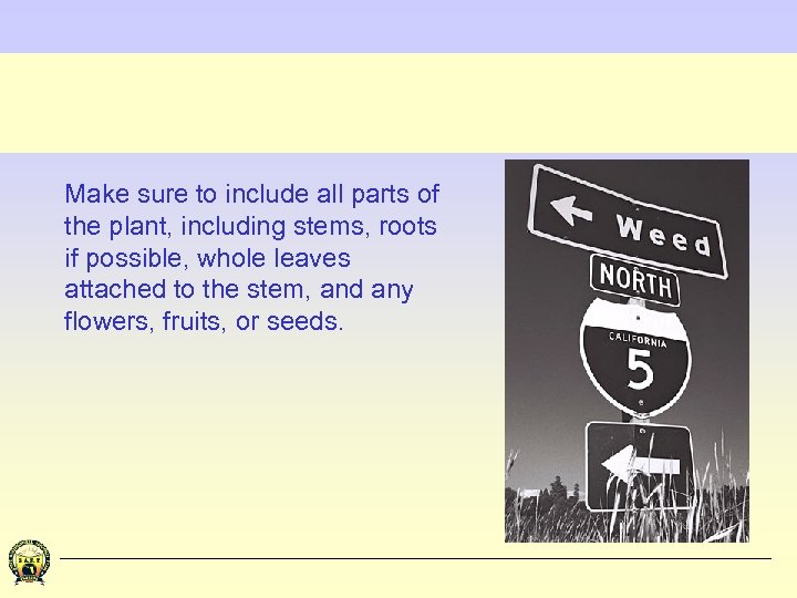 Make sure to include all parts of the plant, including stems, roots if possible, whole leaves attached to the stem, and any flowers, fruits, or seeds.