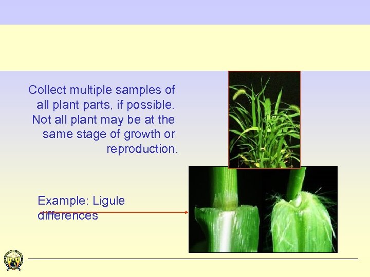 Collect multiple samples of all plant parts, if possible. Not all plant may be at the same stage of growth or reproduction. Example: Ligule differences