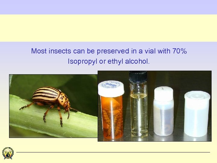 Most insects can be preserved in a vial with 70% Isopropyl or ethyl alcohol.