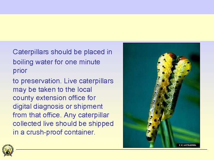Caterpillars should be placed in boiling water for one minute prior to preservation. Live caterpillars may be taken to the local county extension office for digital diagnosis or shipment from that office. Any caterpillar collected live should be shipped in a crush-proof container.