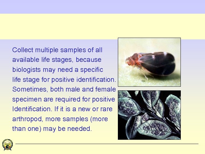 Collect multiple samples of all available life stages, because biologists may need a specific life stage for positive identification. Sometimes, both male and female specimen are required for positive Identification. If it is a new or rare arthropod, more samples (more than one) may be needed.